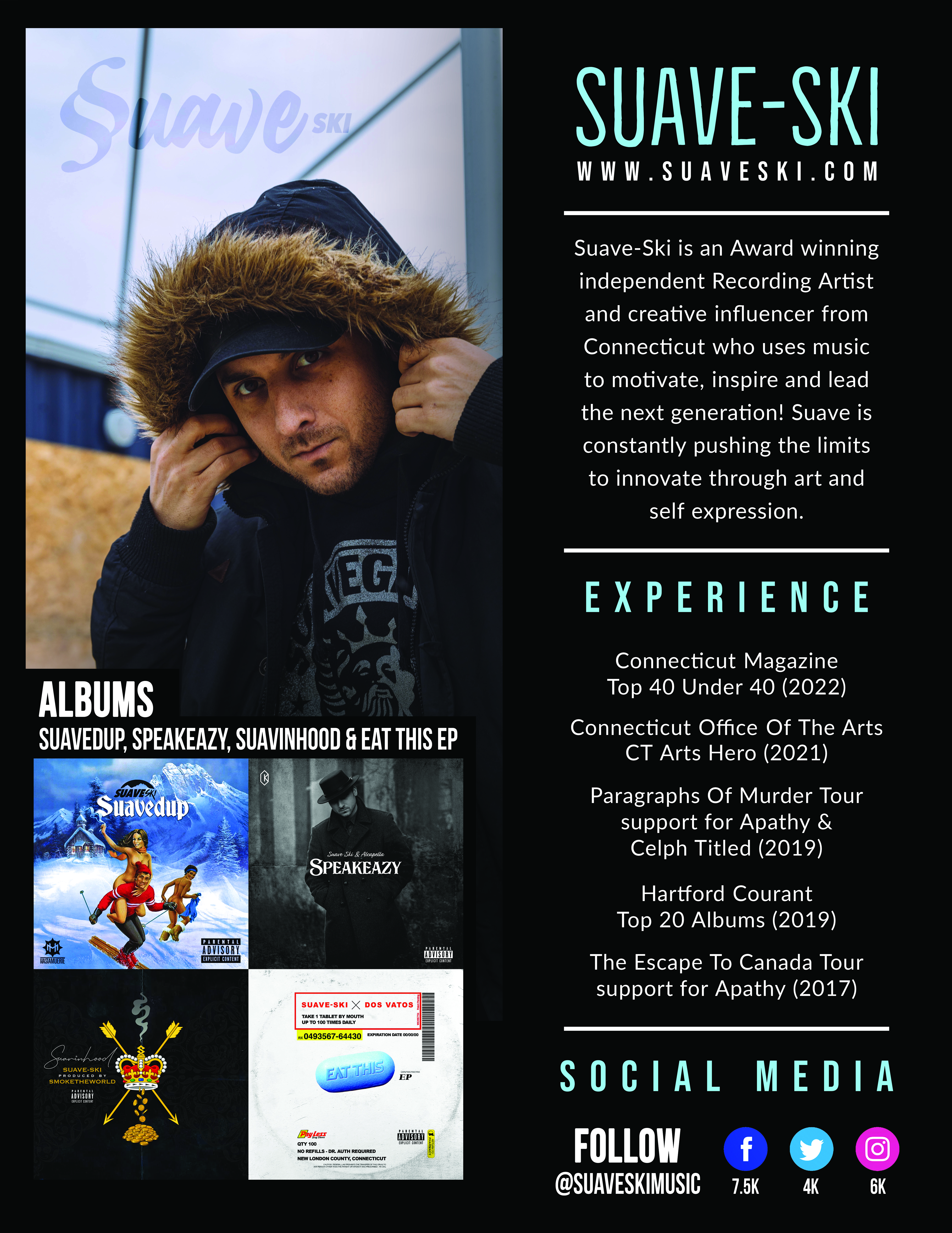 Suave-Ski is an Award winning independent Recording Artist and creative influencer from Connecticut who uses music to motivate, inspire and lead the next generation! Suave is constantly pushing the limits to innovate through art and self expression. His smooth flow, versatile delivery and complex penmanship combine to create truly unique yet eclectic compositions that easily captivate any audience.